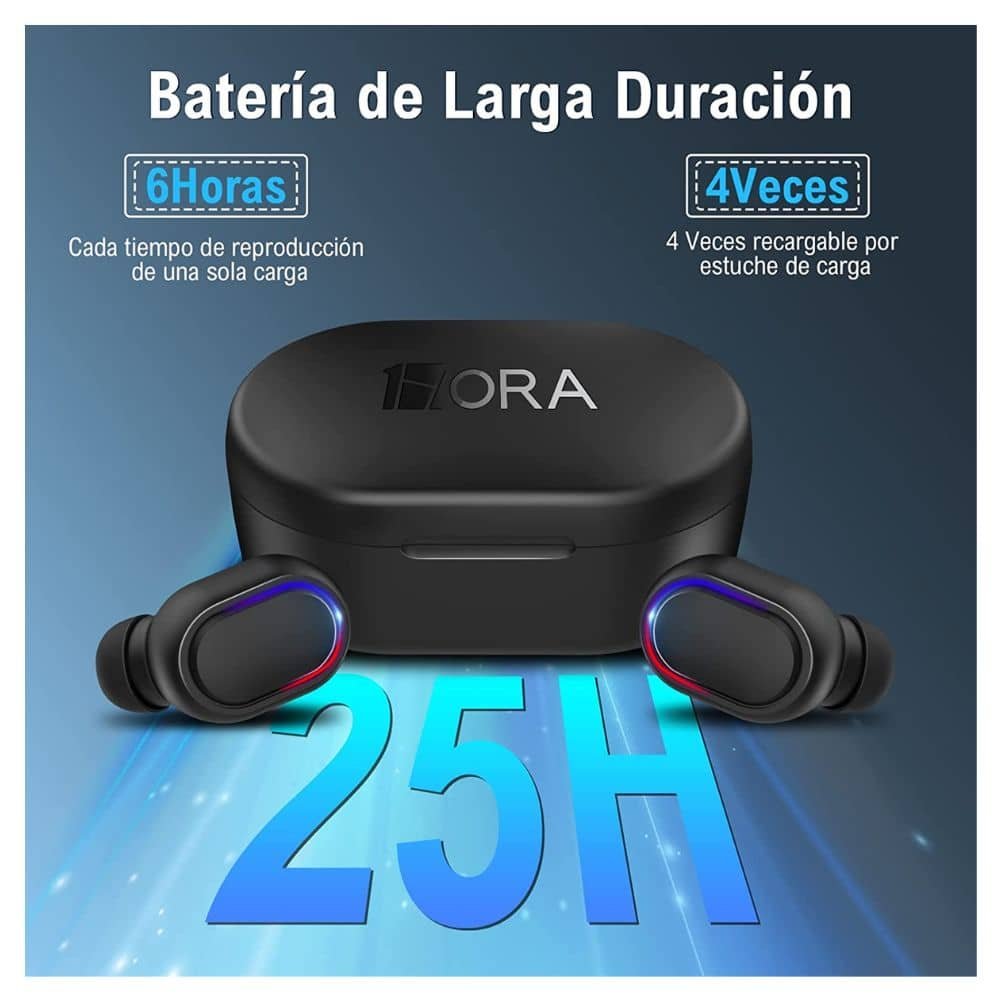 • Larga Duración de Batería: Disfruta de hasta 6 horas de reproducción continua al 100% del volumen con una sola carga. El estuche de carga adicional de 300mAh proporciona 25 horas en total, asegurando que la música no se detenga durante tus viajes o en casa.